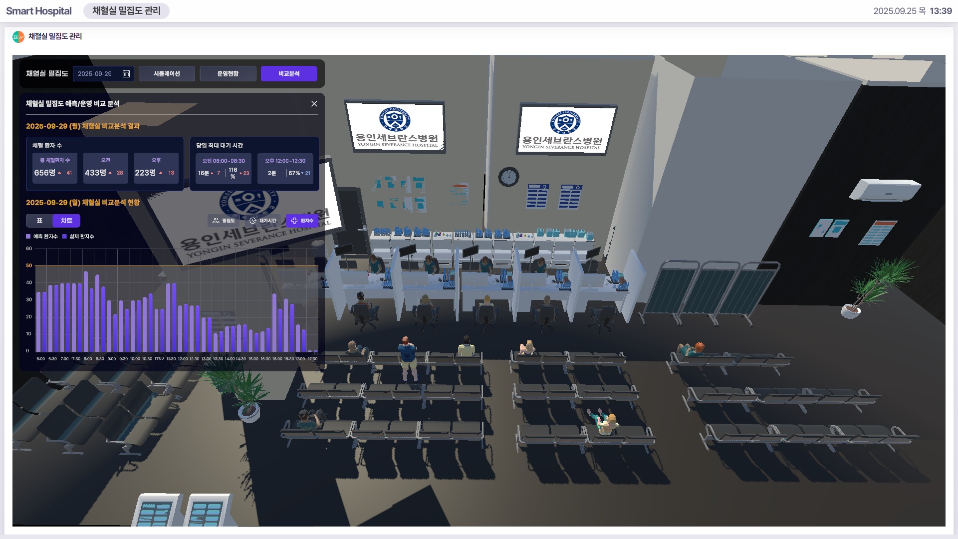 ▲ 실제 병원 구조와 부서 위치, 환자 흐름 등을 가상 세계에 복제한 디지털 트윈 플랫폼을 통해 채혈실 밀집도를 시뮬레이션하는 화면