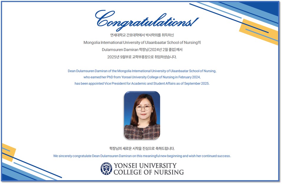 News [Spotlight] Appointment of Dean Dulamsuren Damiran as Vice President for Academic and Student Affairs 관리자 2025-09-12 조회수 539 공유하기 공유하기 페이스북 네이버블로그 카카오톡 카카오스토리 닫기 목록 이전글연세대학교 간호대학생, '유일한 아카데미' 수상 다음글연세대 간호대학 석사과정생 3명, 홍콩중문대 PhD Summer Workshop 추천 및 참여