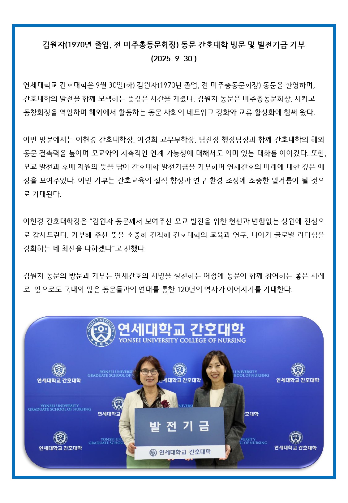 News 김원자(1970년 졸업, 전 미주총동문회장) 동문 간호대학 방문 및 발전기금 기부 [2025.09.30] 관리자 2025-10-01 조회수 436 공유하기 공유하기 페이스북 네이버블로그 카카오톡 카카오스토리 닫기 목록 이전글연세대학교 간호대학, 메풀 전산초 명예교수 기념 학술대회 개최 "차세대 간호과학자 양성: 혁신적 연구·교육·정책” 주제로 미래 발전 방향 모색" 다음글연세대학교 간호대학, 환자안전문화 연구 두각 - 메다파나뉴스
