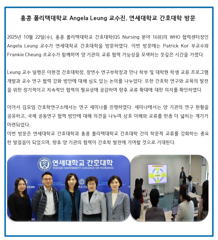 News 홍콩 폴리텍대학교 Angela Leung 교수진, 연세대학교 간호대학 방문 관리자 2025-10-23 조회수 79 공유하기 공유하기 페이스북 네이버블로그 카카오톡 카카오스토리 닫기 목록 이전글연세대학교 김모임간호학연구소, '2025 연세건강이음' 노인돌봄생활지원사 역량 강화 교육 성료 다음글2025년도 World's Top 2% Scientists 선정